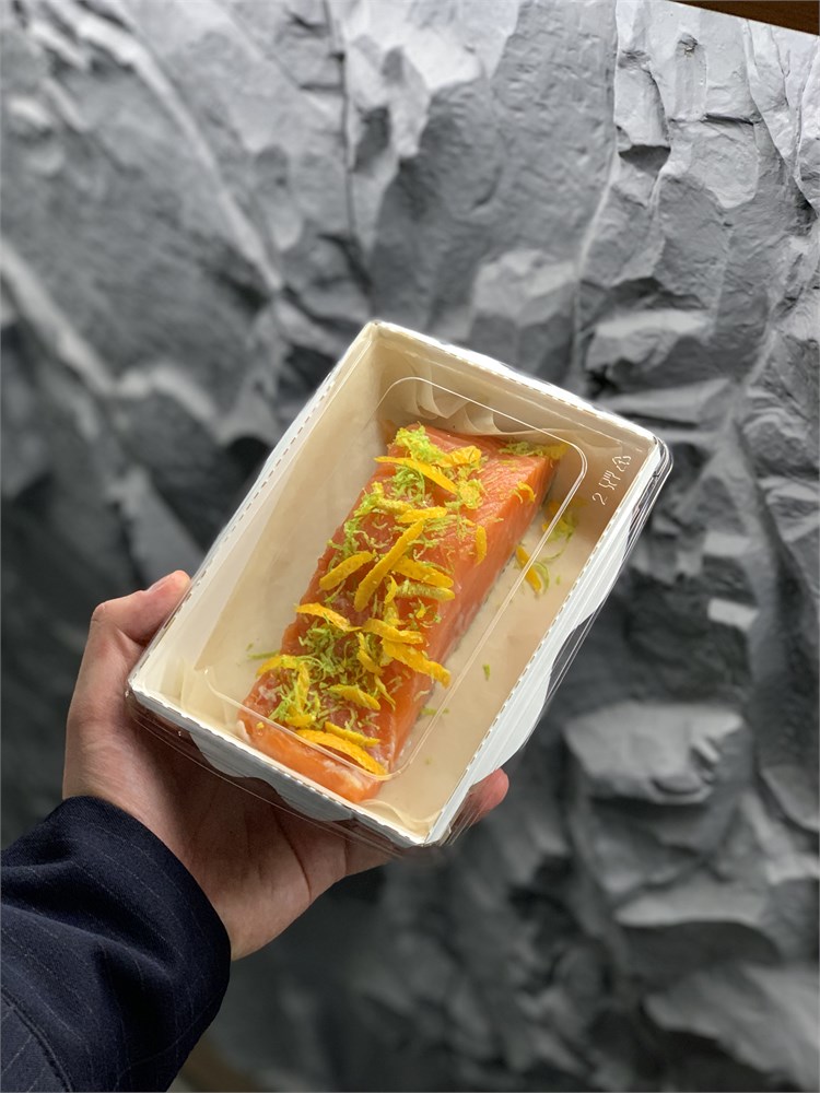 Слабосолёный лосось, цедра апельсина, цедра лимона.