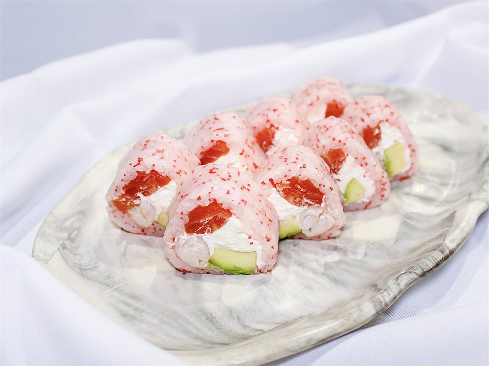 Слабосолёный лосось, креветка, рисовая бумага, тобико красная, рис, огурец, крем-чиз, 324гр