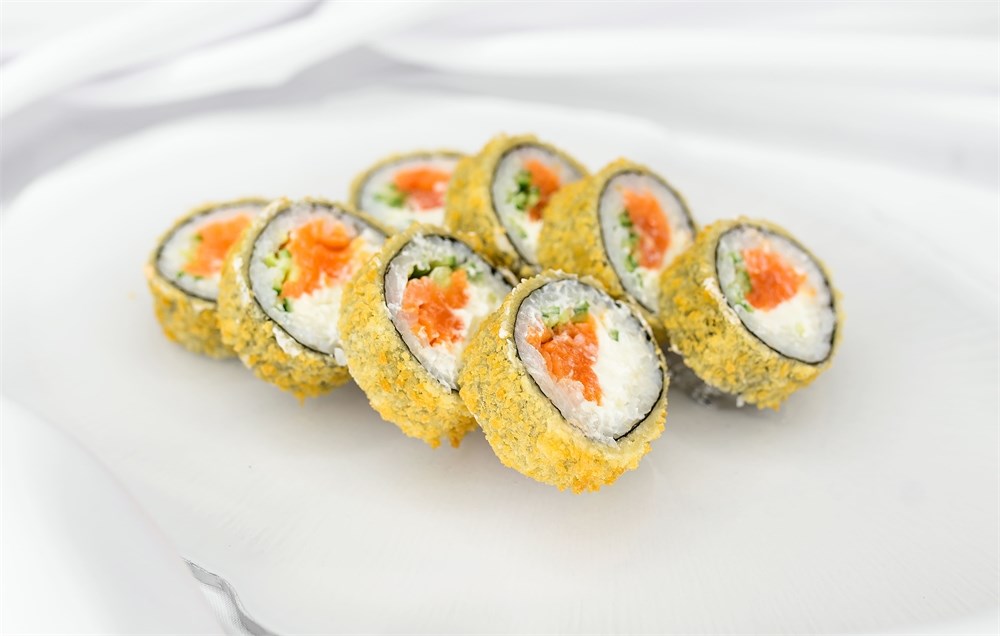 Лосось, рис, нори, огурец, крем-чиз, тобико оранжевая, тесто кляр, сухари панко, 337гр