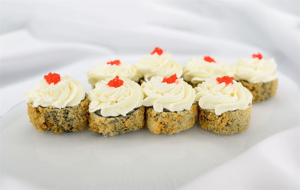 Лосось терияки, рис, нори, огурец, салат айсберг, майонез японский, крем-чиз, тобико оранжевая, тесто кляр, сухари панко, 372гр