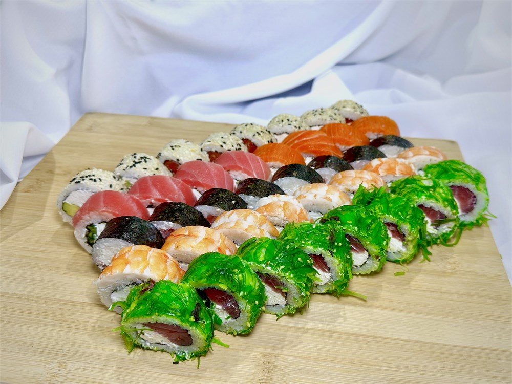 Грин с тунцом, Филадельфия с креветкой, норимаки с тунцом, Филадельфия с лососем в кунжуте микс, Филадельфия дабл, 1430гр
